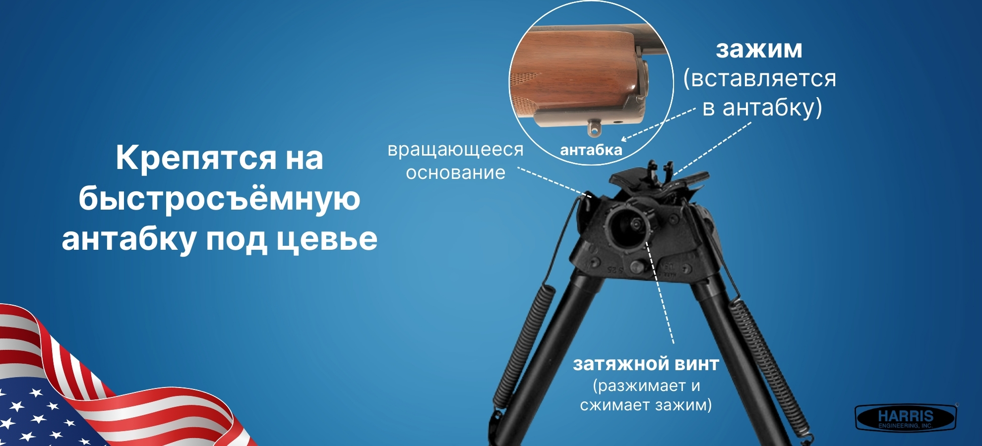 Цельная прочная база крепится под цевьё за антабочный винт или на ствол через специальный адаптер (в комплект не входит, приобретается отдельно).